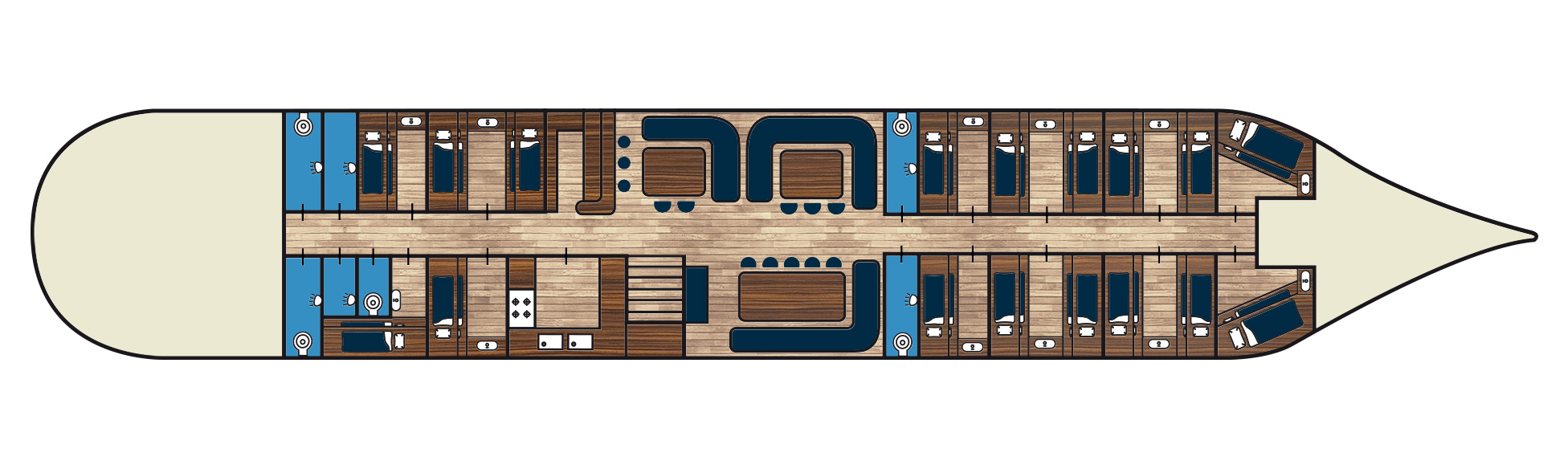 Das Boot bietet 7 Zweibettkabinen mit Einzelbetten (Stockbetten) und 5 Vierbettkabinen mit Einzelbetten (je 2 Stockbetten). Alle Betten sind mit einem Unterlaken sowie einem Kopfkissen mit Bezug ausgestattet, sodass sich jeder Gast rundum wohlfühlen kann.